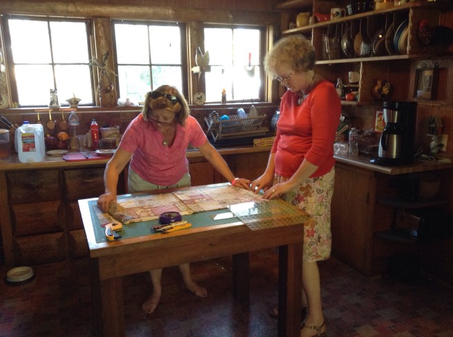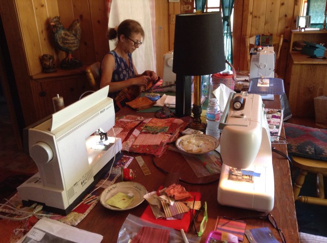 Below is a view of the cabin, and then Caroline with Trina, and then Helen, in the midst of making the hideous number of blocks she needed for the scrap quilt top she finished the next day. Oh to be as productive!
