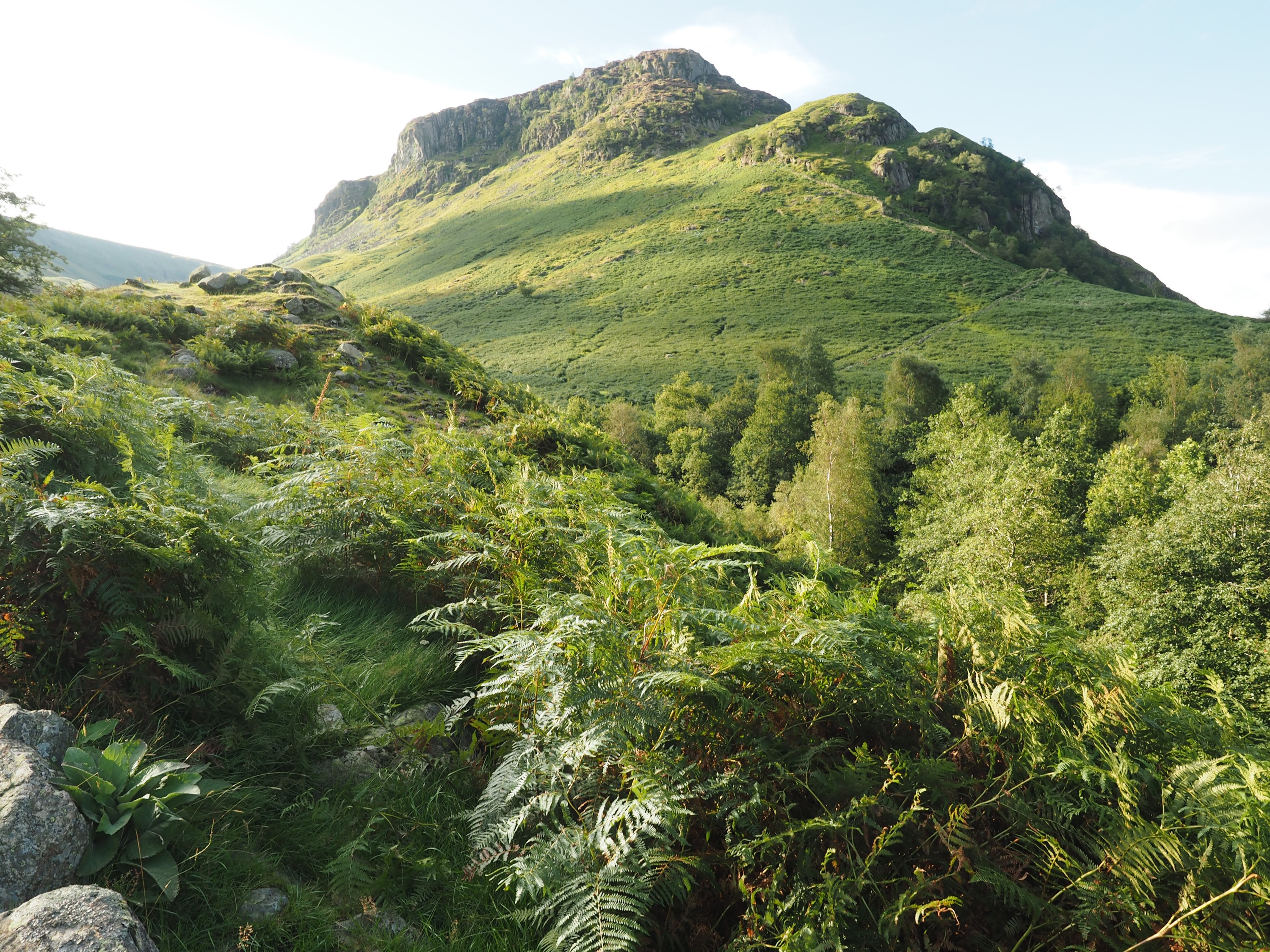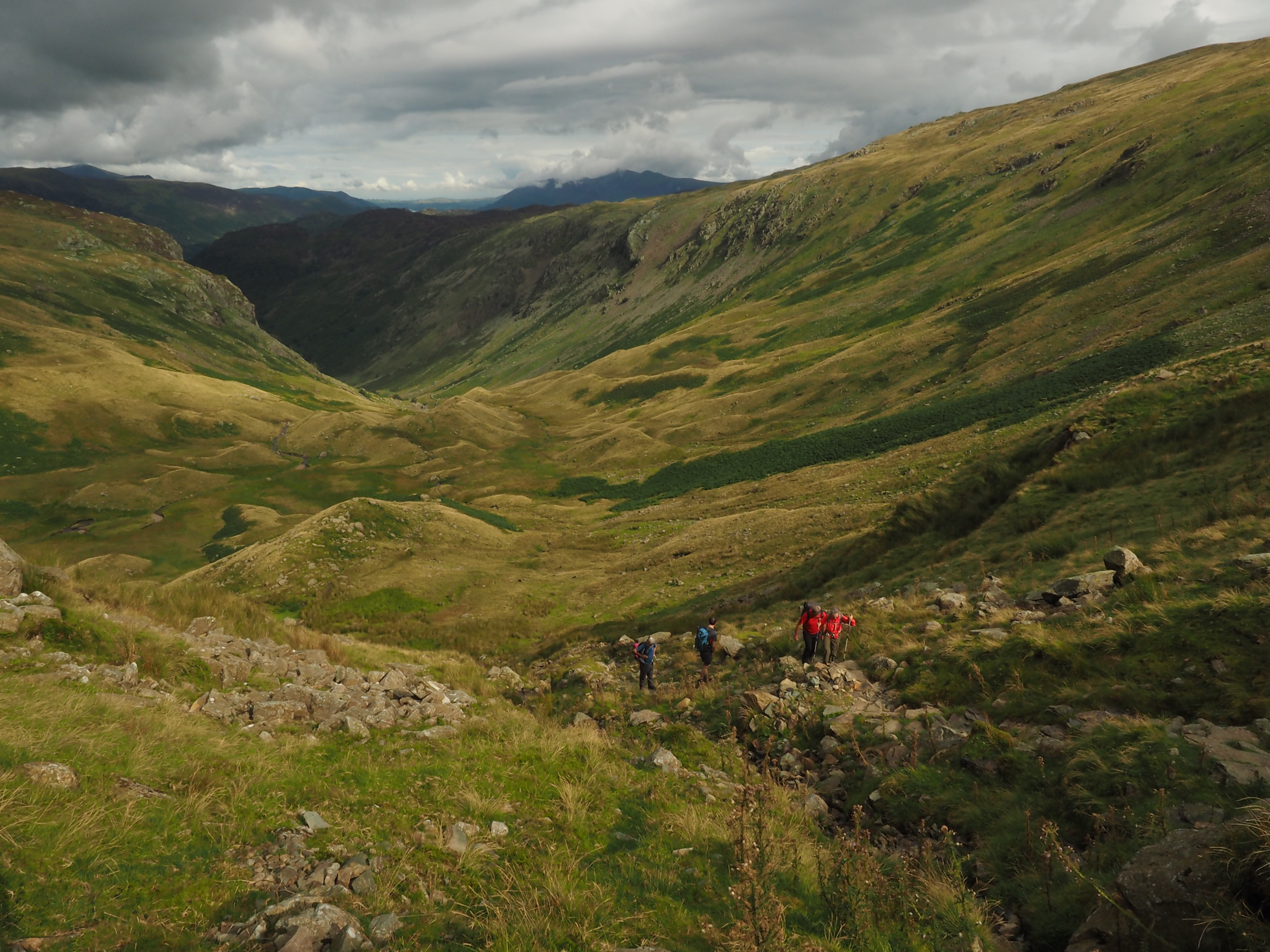 Leaving the bustling metropolis of Rosthwaite (several houses, a post box and a phone box), we headed up the valley to Lining Crag, following Stonethwaite Beck (a small stream). Nice walking on a defined path but a bit rocky in places). Steep haul up to the top of the crag but fabulous views back down the valley.