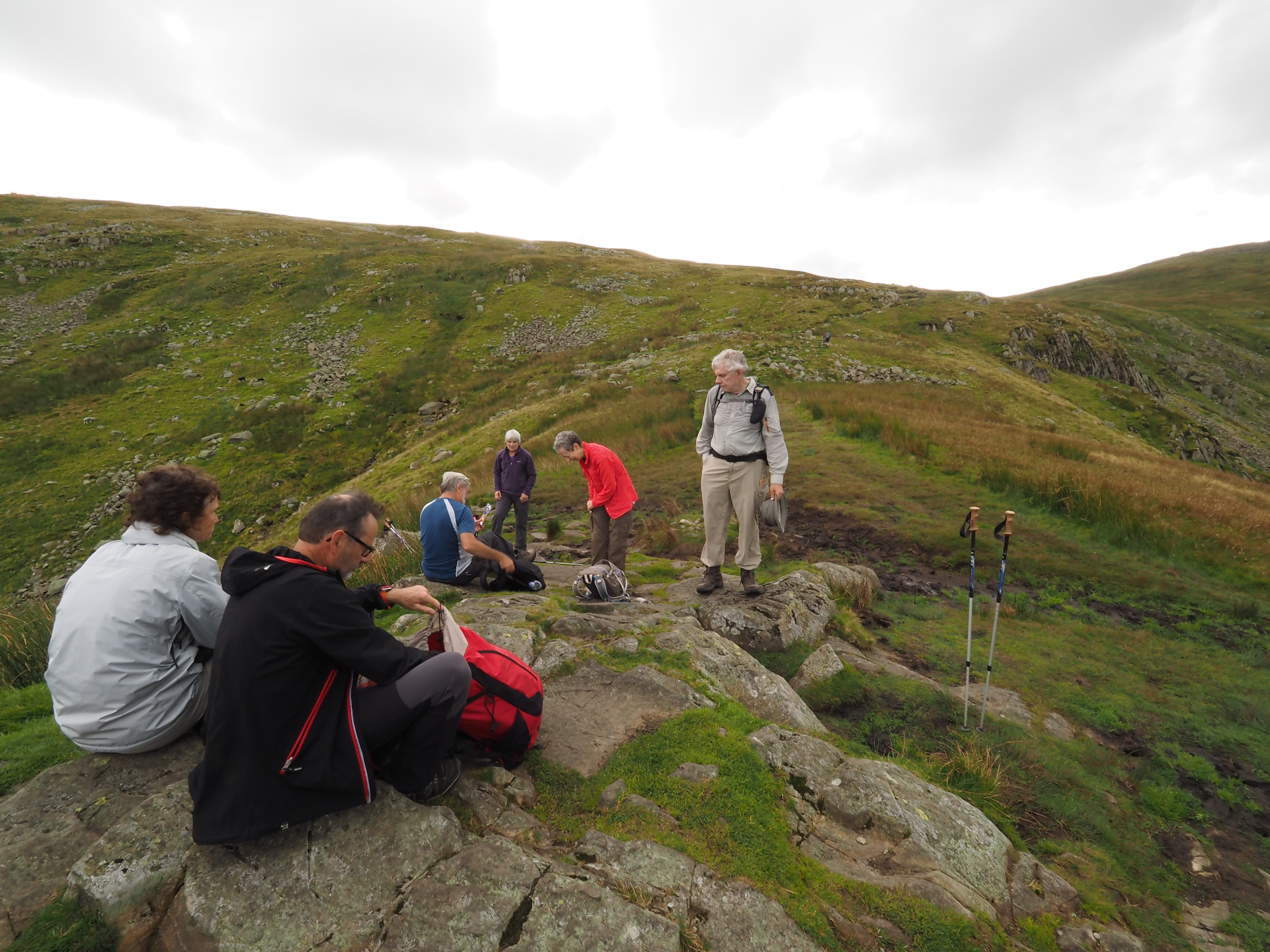 Below are: leaving Stonethwaite, the Tardis to Grasmere (if only it had been true!), Lining Crag – we climbed that, the view back down the valley towards Stonethwaite from the top, lunch stop on Greenup Edge, the view down the valley to Grasmere, standing on the summit of Helm Crag, and the start of the long descent to Grasmere – this makes it look easier than it was!