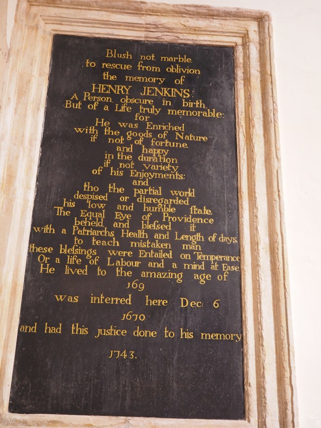 The memorial tablet for Henry Jenkins in St Mary’s at Bolton.