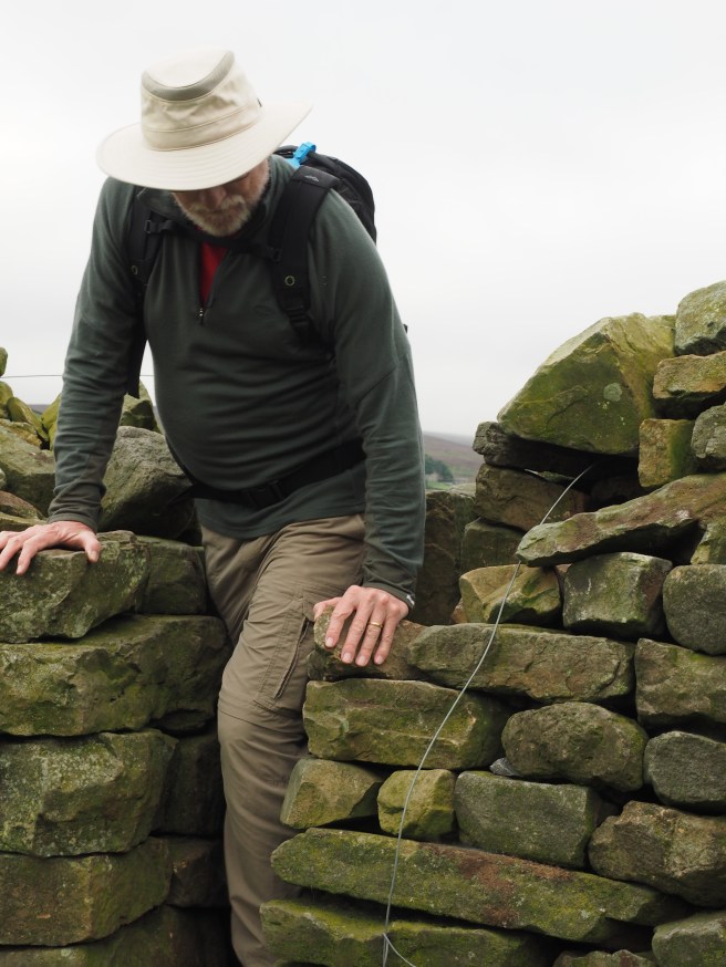 Set out from Reeth in some light drizzle, and walked down a valley across fields to reach Marrick Priory, now an outdoor education centre.  Encountered along the way what are called in Yorkshire ‘squeeze belly entries’ – very narrow stone stiles.
