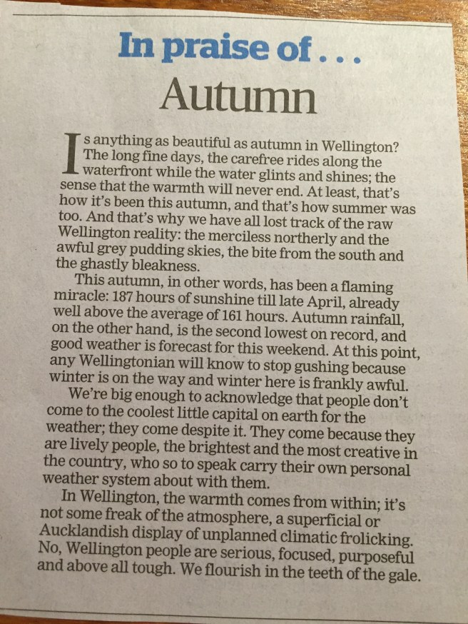 If you have ever lived in Wellington… May 2, 2016May 2, 2016 ~ lcbull2003 This editorial from the weekend Dominion-Post sums up summer and the change we all know is coming! Share this: Click to share on X (Opens in new window) X Click to share on Facebook (Opens in new window) Facebook Like Loading...