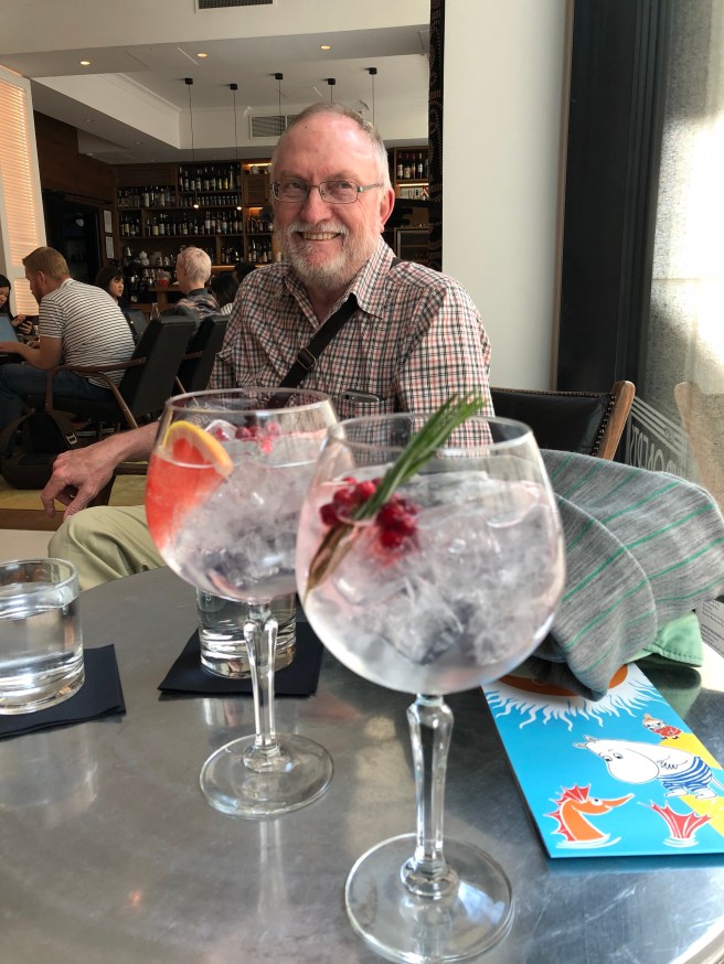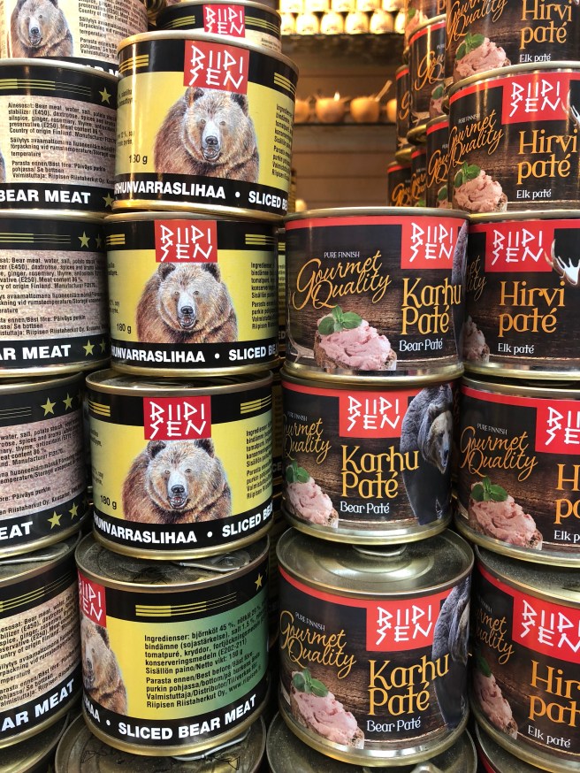 Finland has a really short growing season and unsurprisingly a lot of it’s traditional food is based on root vegetables  – particularly potatoes and grains  – both of which keep over the long winter.  So we tried barley porridge (not my thing)  and rye flour pastries filled with rice porridge (a bit bland).  From there it got a bit more interesting with pork sausage (like a german wurst) and sauerkraut with a beer tasting for lunch, a cheese tasting,  jams using local berries (sea buckthorn again – like a really tart fruit bomb) and coffee and pastries to finish.  And back at the hotel we had our own local gin tasting 😀!