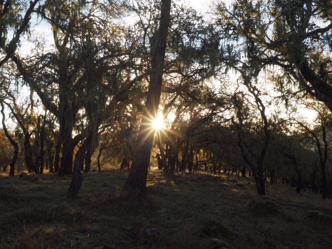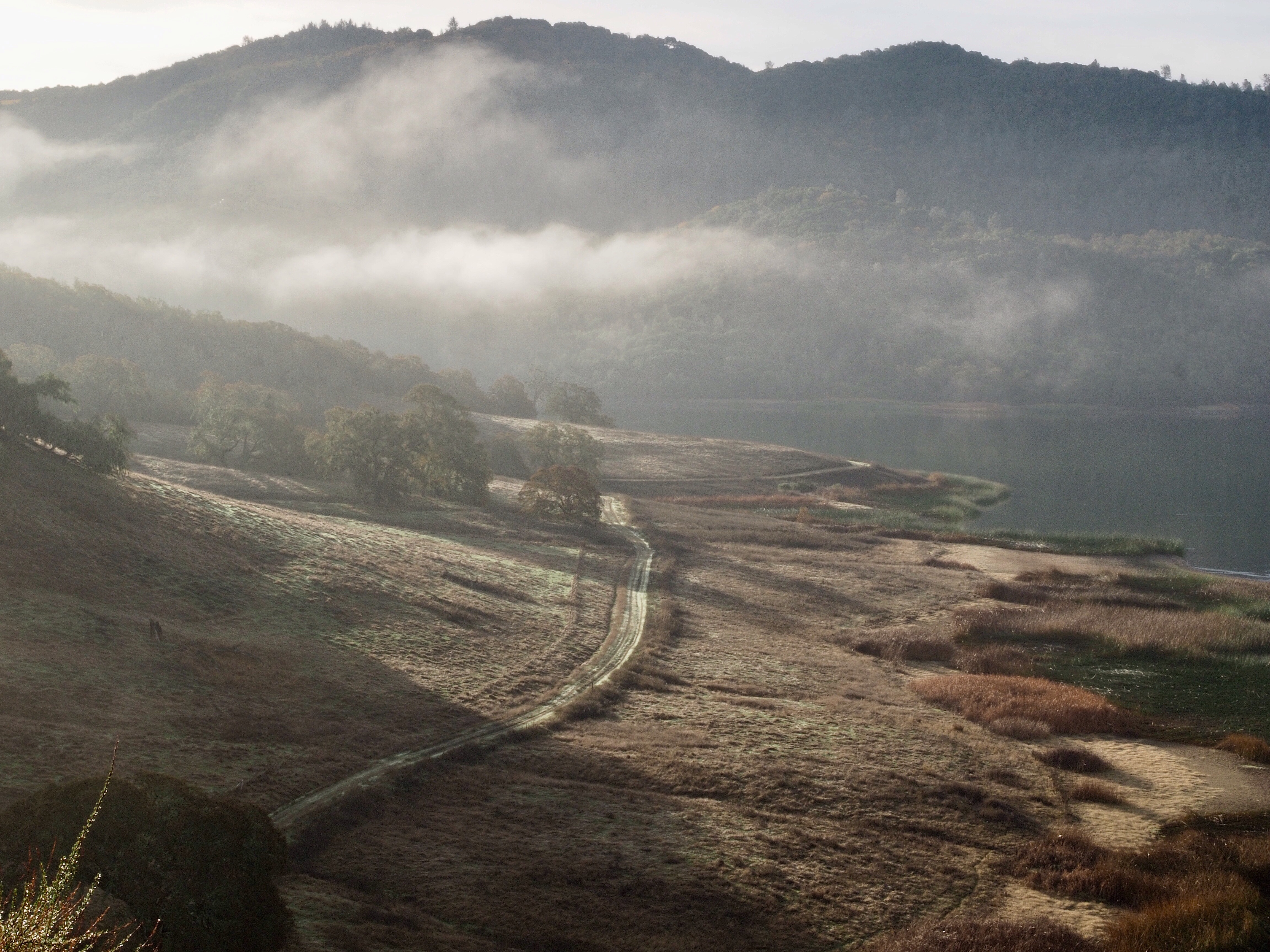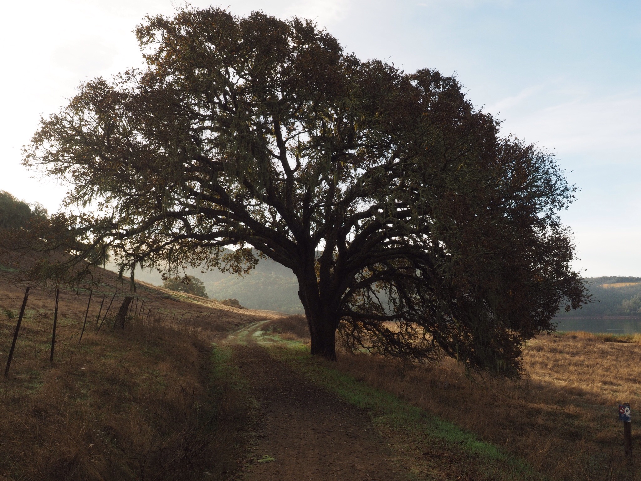The day after Thanksgiving was supposed to be fine and sunny, so Caroline and I headed off early to walk a trail on the opposite side of Lake Hennessey from them. Luckily for us, the forecast was correct and we got some nice views and autumn colour as we walked the Sam the Eagle trail (unlike Moore Creek Park there were signs and names for the trails). At the top of the trail was some light woodland of oaks draped with spanish moss, and we got some nice views over the lake. Unfortunately the water birds played hard to get by staying out in the middle of the lake..