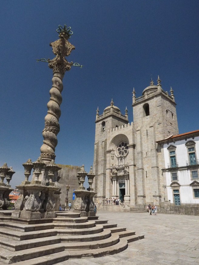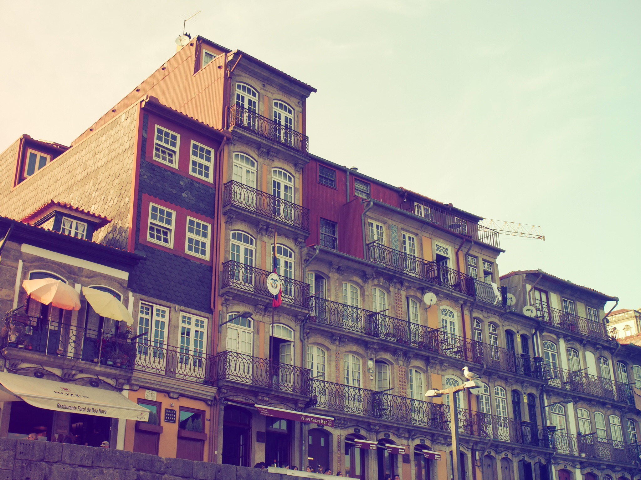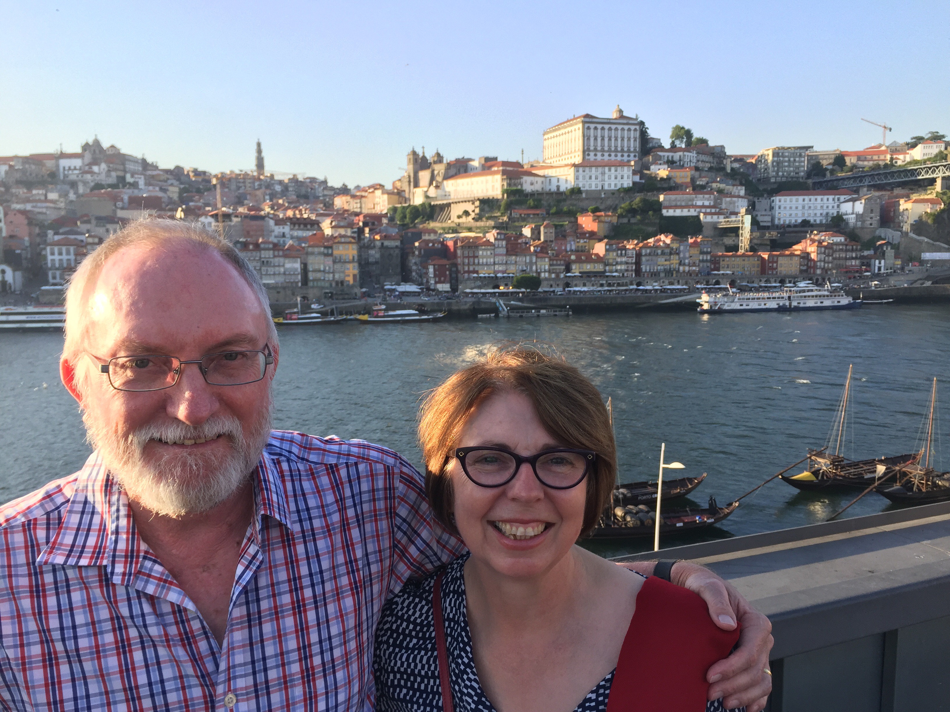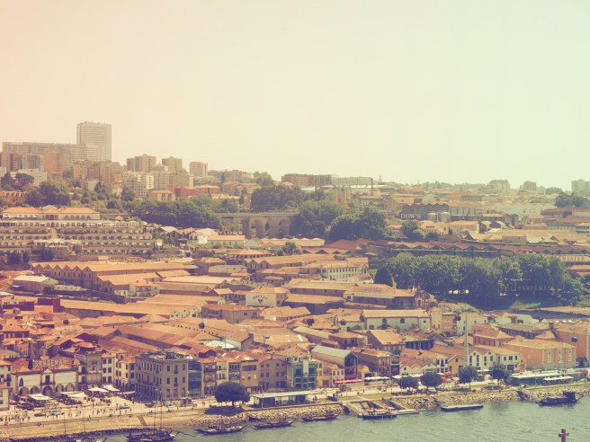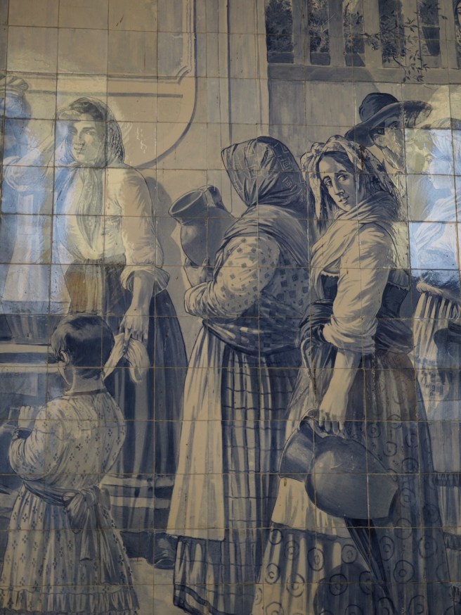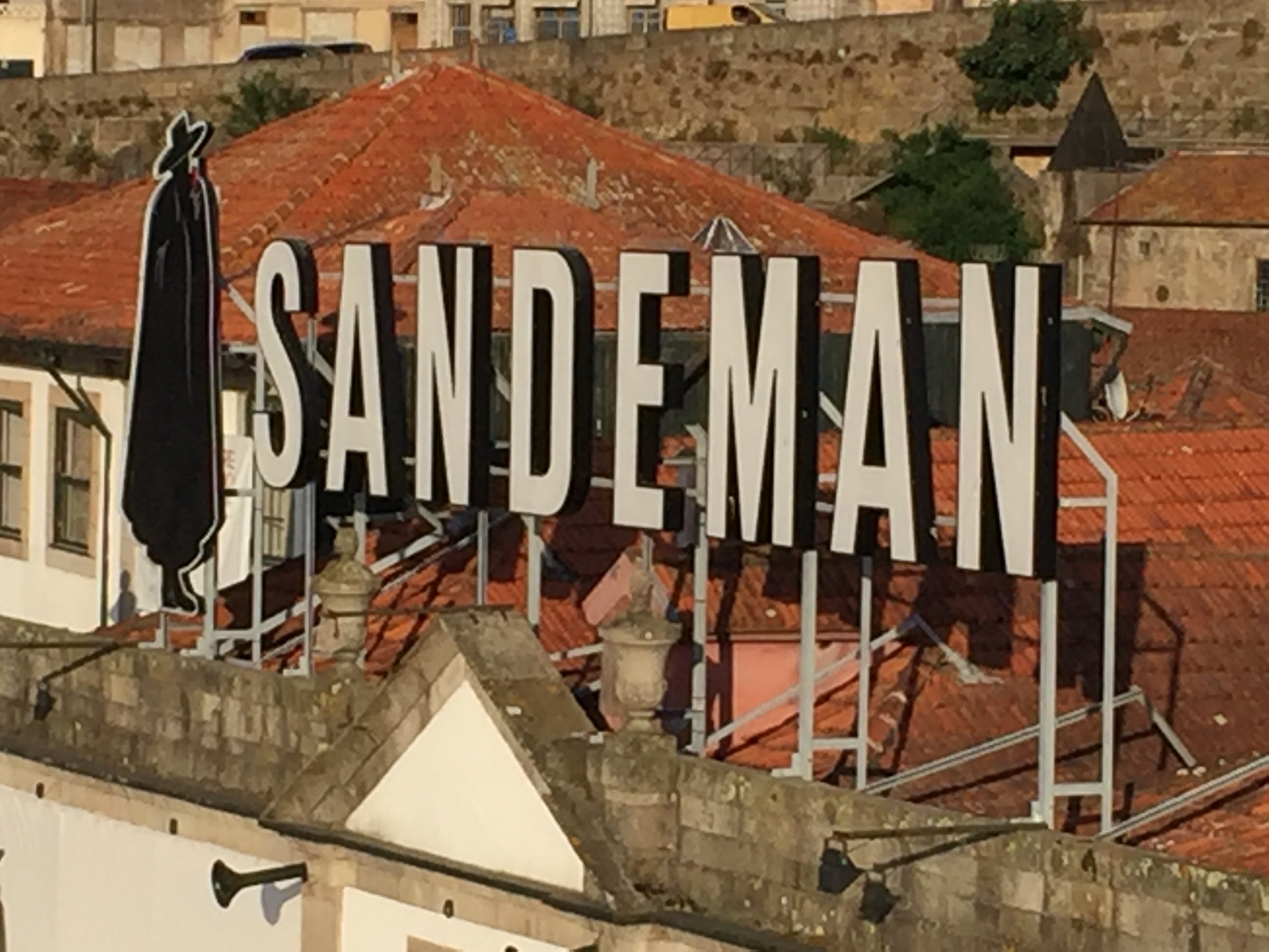 So, a few more pics – a view across the Douro, a scene from the marvellous tiles in the railway station which illustrate aspects of the history of Portugese life, some city buildings and the Sandeman port sign in Gaia, across the river.