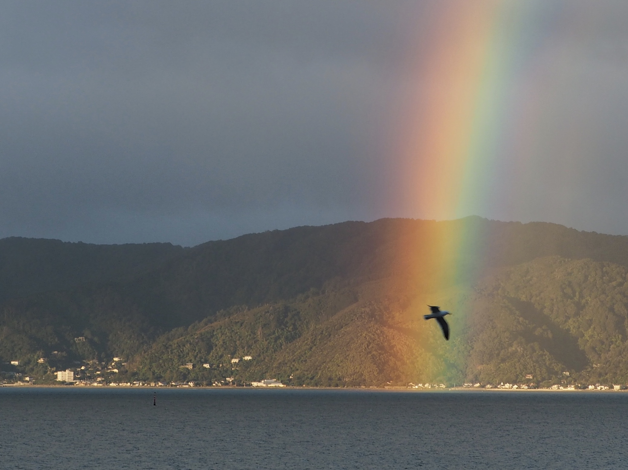Cuba Street architecture – we had lunch just up the street. A light dusting of snow on the Rimutaka hills across the channel.Bird in a rainbow across the channel.