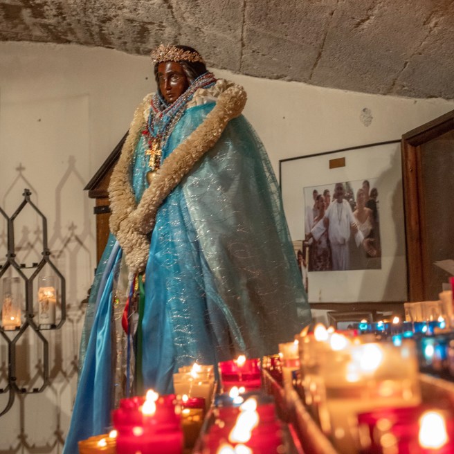 From the roof of Notre Dame de la MerBullfighting is a thing in this part of the world too: Saintes Marie had a small arena but they don’t kill the bulls here.Vovo, one of the champion bulls immortalised outside the arenaSaint Sarah: patron saint of the Romani people who arrived in Saintes Maries withe the two Sains for who the town is named.From the Constance Tower on the walls of Aigues Mortes looking up the Canal du Rhône à SèteOne of the little chapels inside Notre Dame des Sablons, Aigues MortesFrom the Constance Tower this time looking over the salt works on the edge of the town
