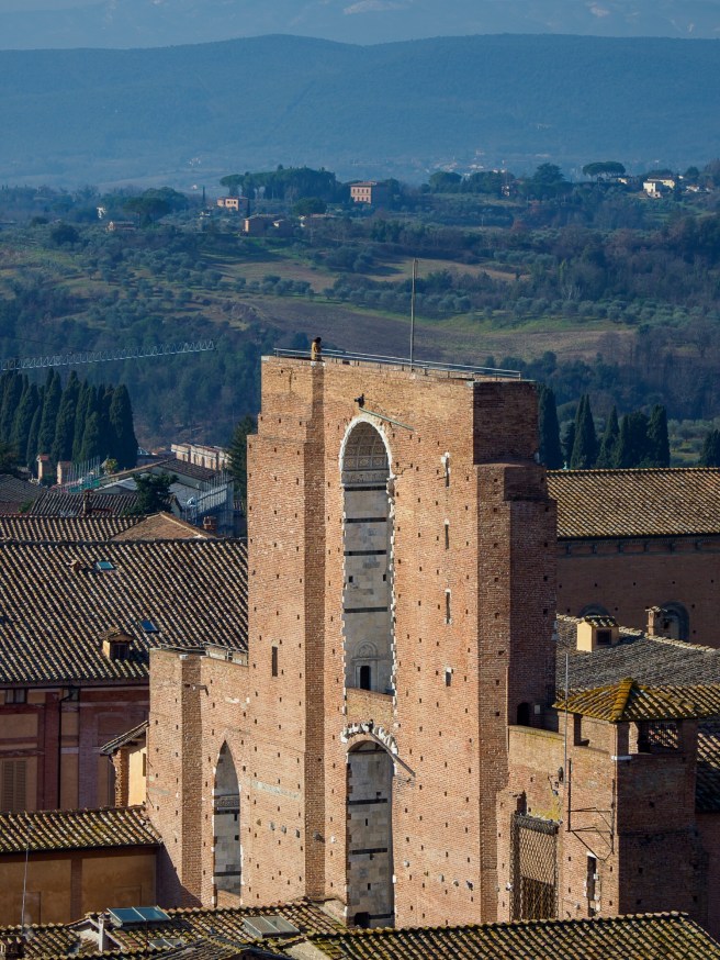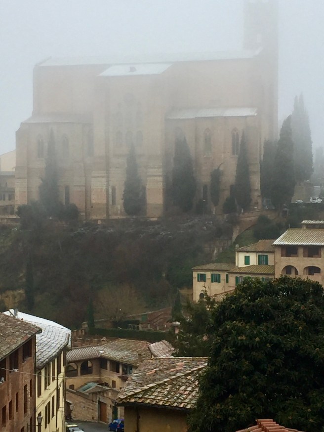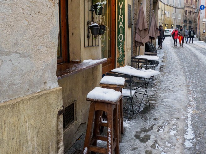 Our hotel is very comfortable and very central. It’s more like a small apartment with a kitchenette/lounge and separate bedroom. We had a quick meet, greet and orientation with a young guy from the firm we have organised the trip through and then we had a bit of a wander in town. The city is small (only around 200,000 people) and the centre of town is quite compact. Good thing we had snow practice in Siena though – it’s been snowing since we arrived – so after a quick walk around we retreated home. It’s supposed to stop when we go out for dinner tonight.