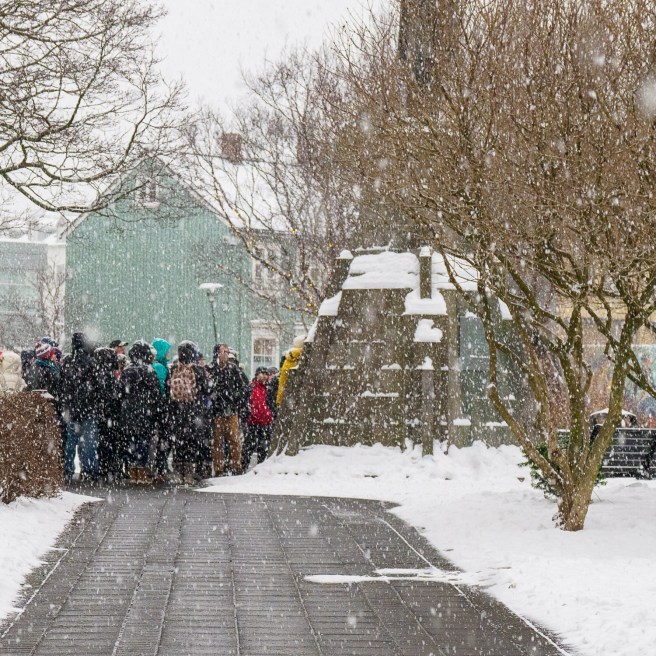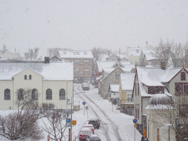 And so, after that early check in and after a flight of around 4 1/2 hours we arrived in Iceland. After the most casual immigration check (two police checked documents – no booths, no stamp, no e-gate) we picked up our bags, found our transport and were whisked across a snowy landscape to Reykjavik. It was a bit like the Desert Road with heavy snow and no tussock. The light was amazing – black, almost green low clouds on one side, little bursts of sun through lighter clouds on the other. And it light made it feel for all the world like 4:30pm rather than lunchtime.